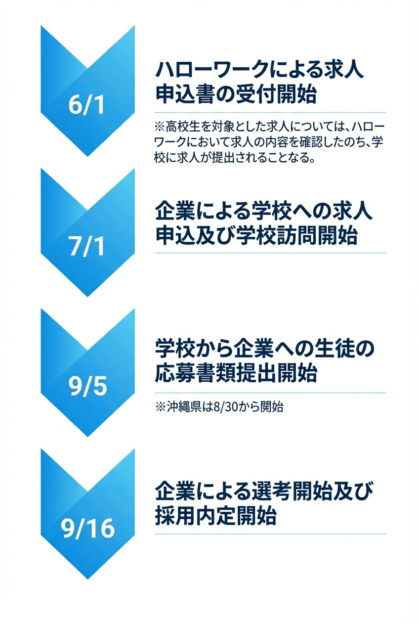 厚生労働省によると、令和8年3月に高校を卒業する生徒の就職活動の流れは以下の通りでした。