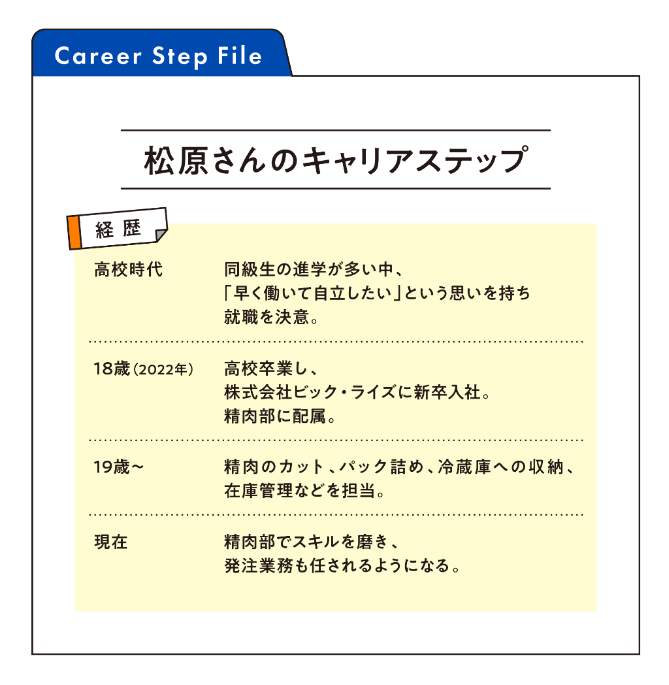 精肉部に配属いただき、お肉のカットやパック詰め、冷蔵庫への収納、在庫の管理などをしています。こちらの店舗でずっと働いています。最初はただ“言われたことをやる”という感じでしたが、最近では発注も任せてもらえるようになりました。精肉のカットは包丁の角度や力加減ひとつで、仕上がりが全然違うんです。豚肉より牛肉の方が難易度は高いんですよ。長く働いている先輩は本当に手際がよく綺麗なカットで、憧れの存在です。
