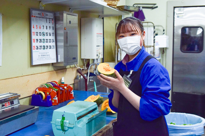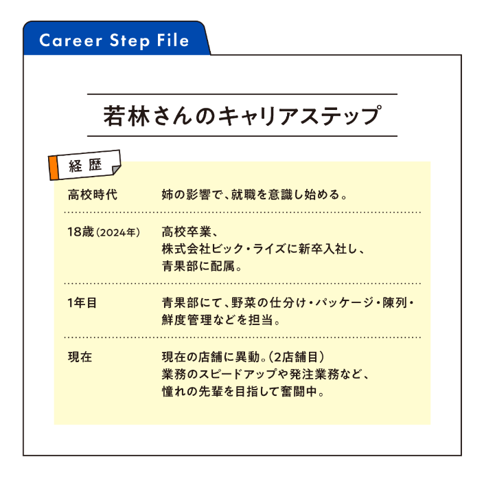 青果部では、毎朝届く野菜を仕分けやパッケージをして売り場に出したり、鮮度が落ちた野菜を回収して売り場を作ります。私は今の店舗で2店舗目になります。今は少しずつ、鮮度を見極める“目”が養われてきた気がします。憧れのチーフのように、正確で効率よく仕事ができるようになりたいです。まだ1時間くらいかかってしまうんですが、少しずつ早く、正確にできるように努力しています。