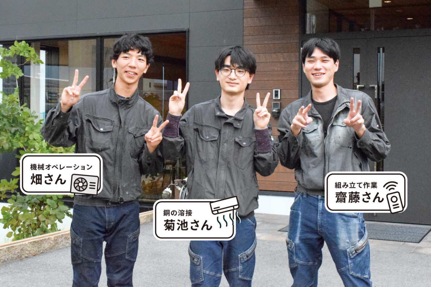 空調設備の製造を支える一連の工程で銅の溶接、機械オペレーション、組み立て作業など、それぞれの持ち場で技術を磨き、やりがいを見つけながら日々挑戦を続けています。