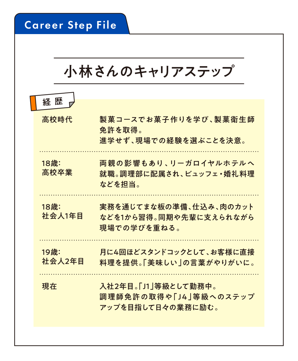 リーガロイヤルホテルズには、一般職のステップとして「J1」から「J4」までの等級があり、小林さんは現在「J1」。