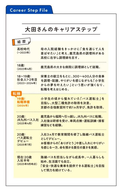 鹿児島県出身の大田さんは、高校卒業後に病院で調理師として経験を積んだのち、自費で大型自動車第二種免許を取得し、20才でJR九州バスへ転職。小学生の頃からの夢だったバス運転士としてデビューを果たしました。