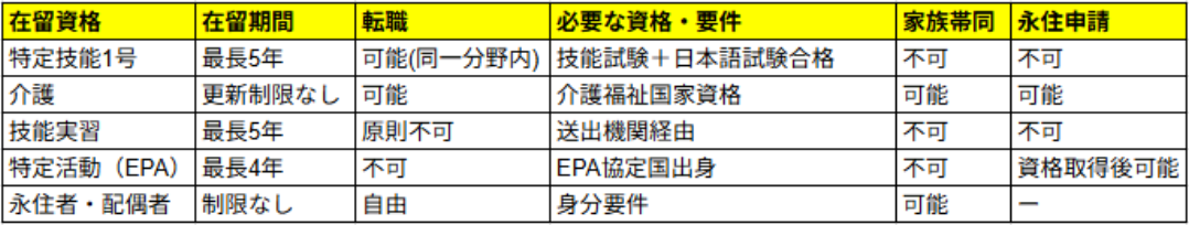 表】特定技能「介護」と他の在留資格の比較表