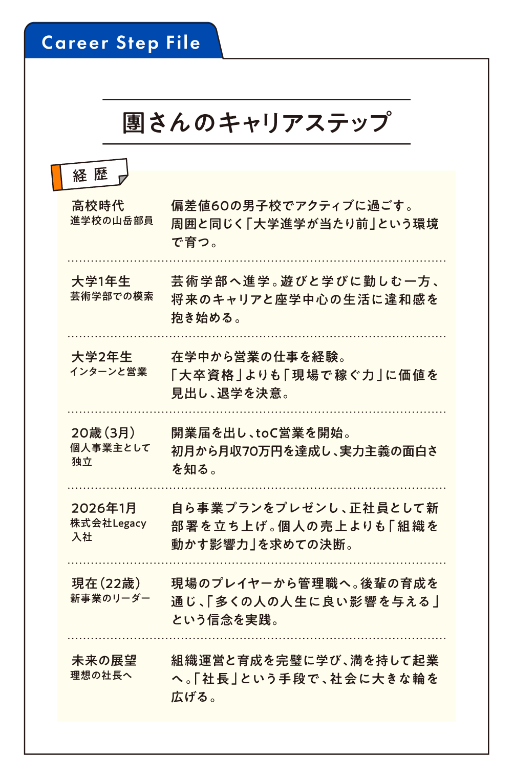 その後は個人事業主の営業として月収70万円を稼ぎ、2025年1月からは株式会社Legacyで正社員として新事業を立ち上げました。そこには、野心だけではなく、「人の人生に良い影響を与えたい」という、中学生の頃から変わらない一本の軸があります。