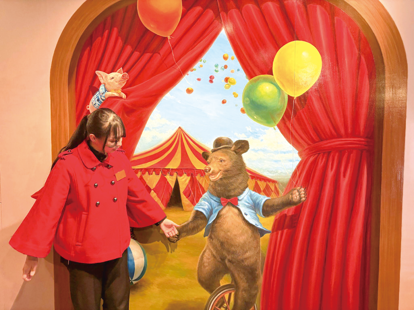 当社が運営するトリックアート施設のひとつ「那須とりっくあーとぴあ」で館内のお客様対応をしています。トリックアートの魅力をお伝えしたり、館内をご案内したりしながら、写真撮影のサポートもします。